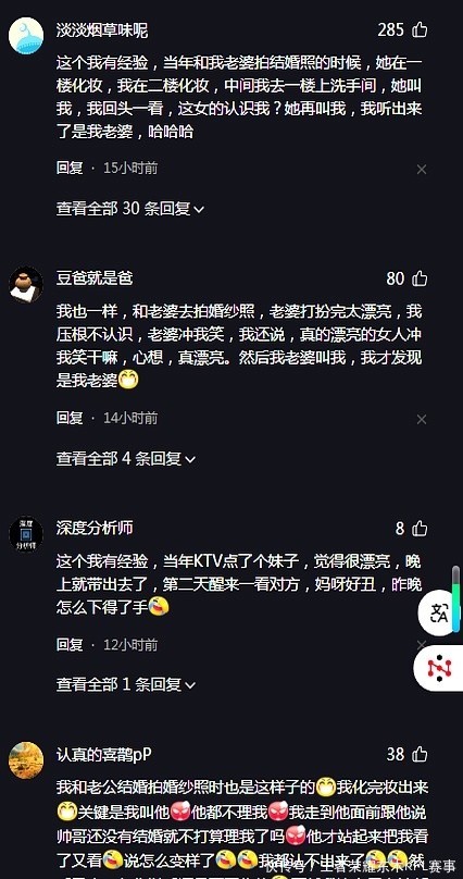 就像有个网友说的:“我老公当年看到我穿敬酒服也愣了,一脸呆滞,后来说,平时看我戴眼镜,其实没想着还能有眼前一亮的感觉。”这话听着有点直男,但又很让人觉得甜。